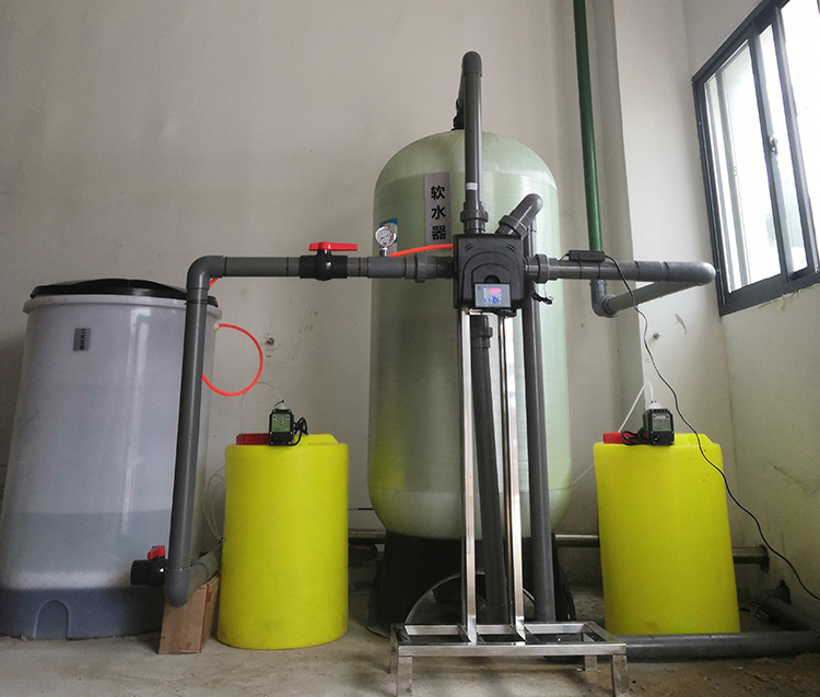 由于水的硬度主要由鈣、鎂形成及表示,故一般采用陽離子交換樹脂(軟水器),將水中的Ca2+、Mg2+(形成水垢的主要成份)置換出來,隨著樹脂內Ca2+、Mg2+的增加,樹脂去除Ca2+、Mg2+的效能逐漸降低。